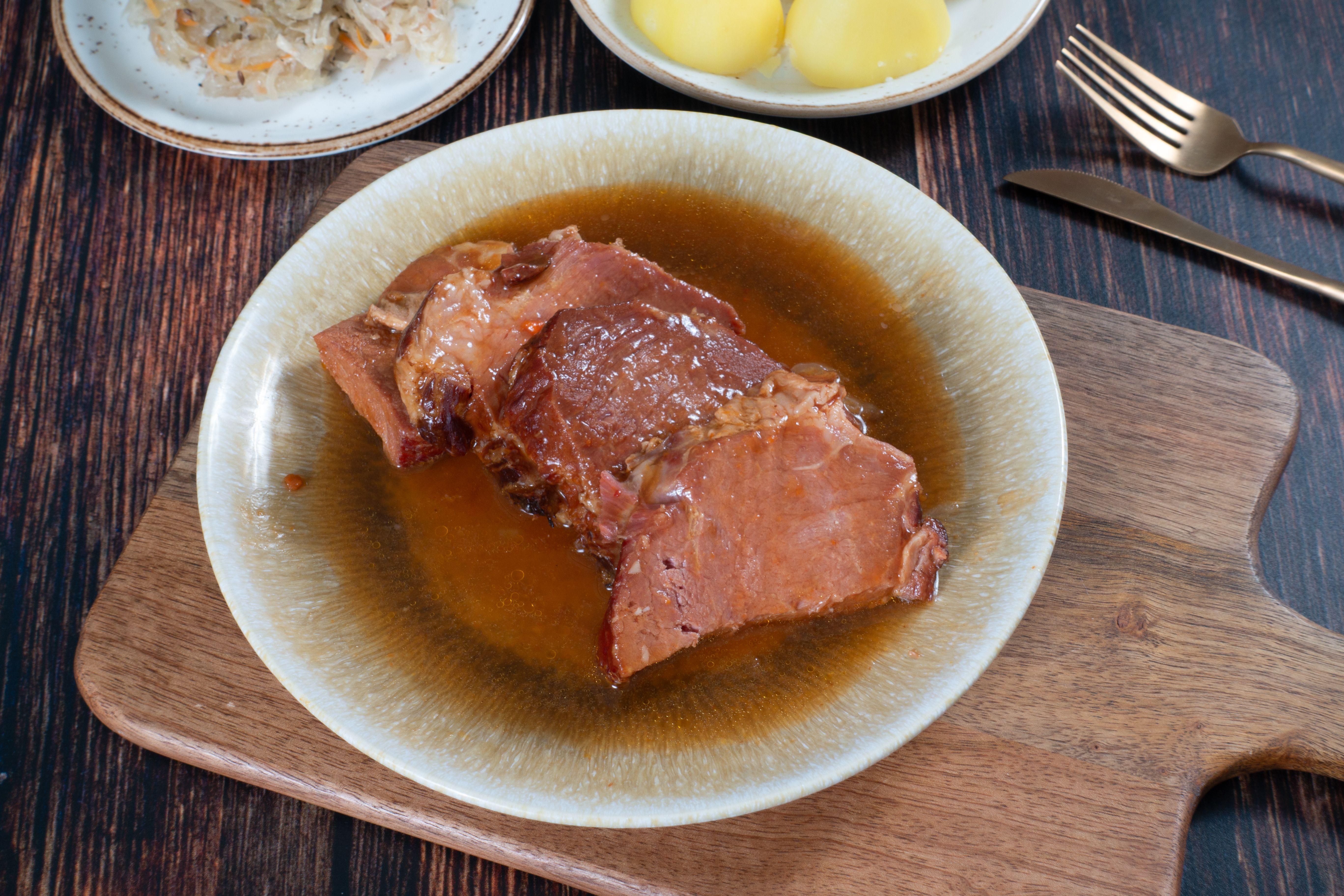 Zarter Kasslerbraten, liebevoll hergestellt aus gepökeltem Schweinefleisch und verfeinert mit einer herzhaften Soße. Ein Stück deutscher Küchentradition, das mit Kartoffeln und Sauerkraut zum wahren Ostergenuss wird. Einfach erwärmen und genießen!